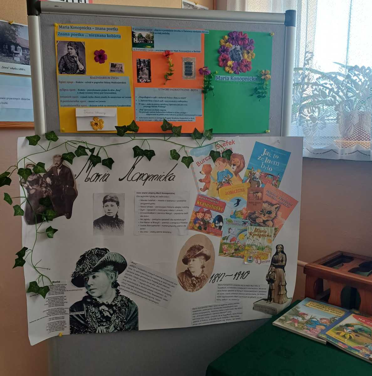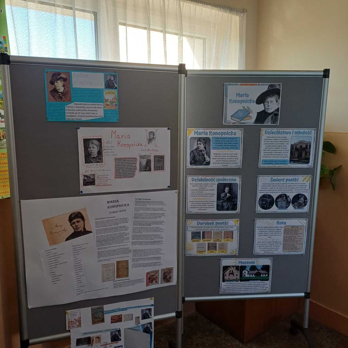 Plakaty przedstawiające Marię Konopnicką zdobią szkolny korytarz, a także przyciągają młodsze dzieci, które mogą w przystępny i ciekawy sposób poznać życie oraz twórczość poetki. Krótkie opisy i obrazki sprawiły, że korytarz zamienił się w małą galerię wiedzy.