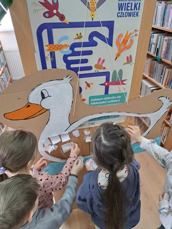 W minionym tygodniu nasze przedszkolaki przeżyły wyjątkową przygodę w bibliotece. Podczas spotkania wspólnie przeczytaliśmy ciekawą książkę o kaczce, która bardzo spodobała się naszym małym słuchaczom. Po części czytelniczej przyszedł czas na kreatywną zabawę. Zadaniem przedszkolaków było odnalezienie ukrytych wśród książek piórek kaczki. Następnie wszystkie piórka zostały przyklejone do dużego wizerunku kaczki znajdującego się w bibliotece, tworząc wspólne dzieło.