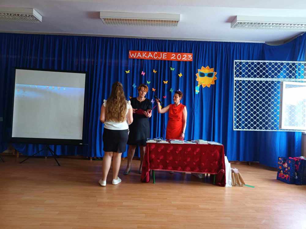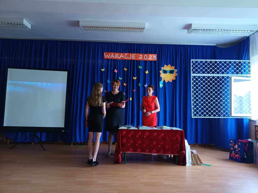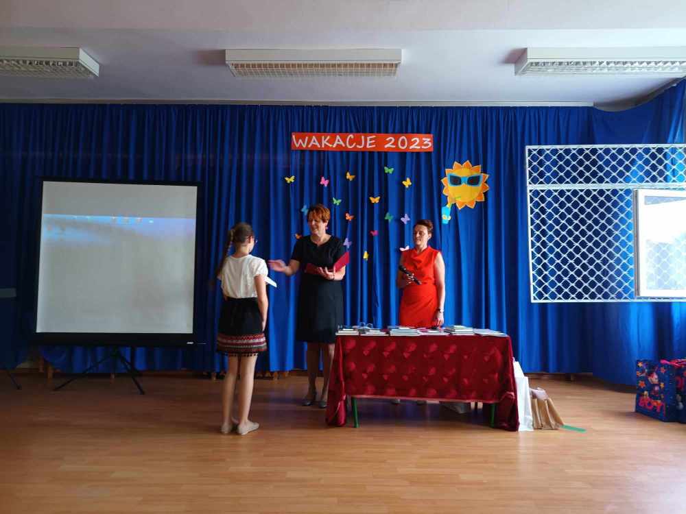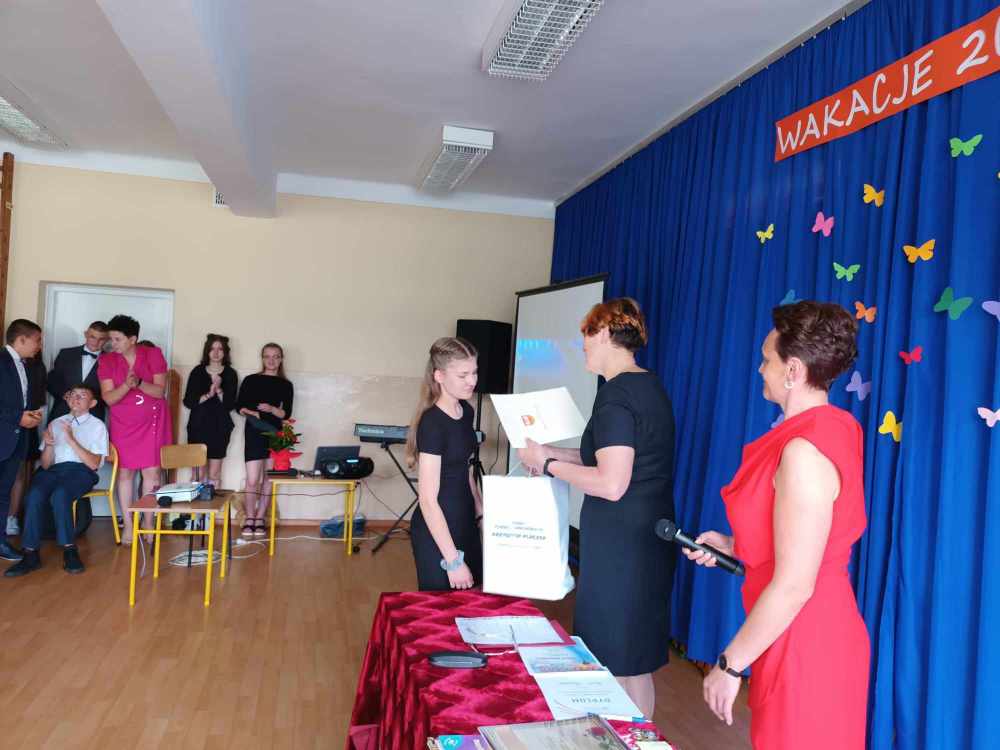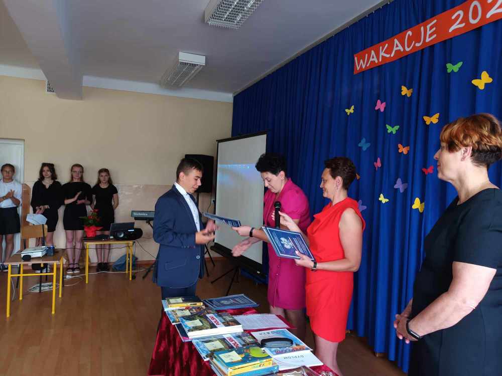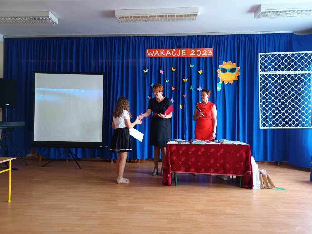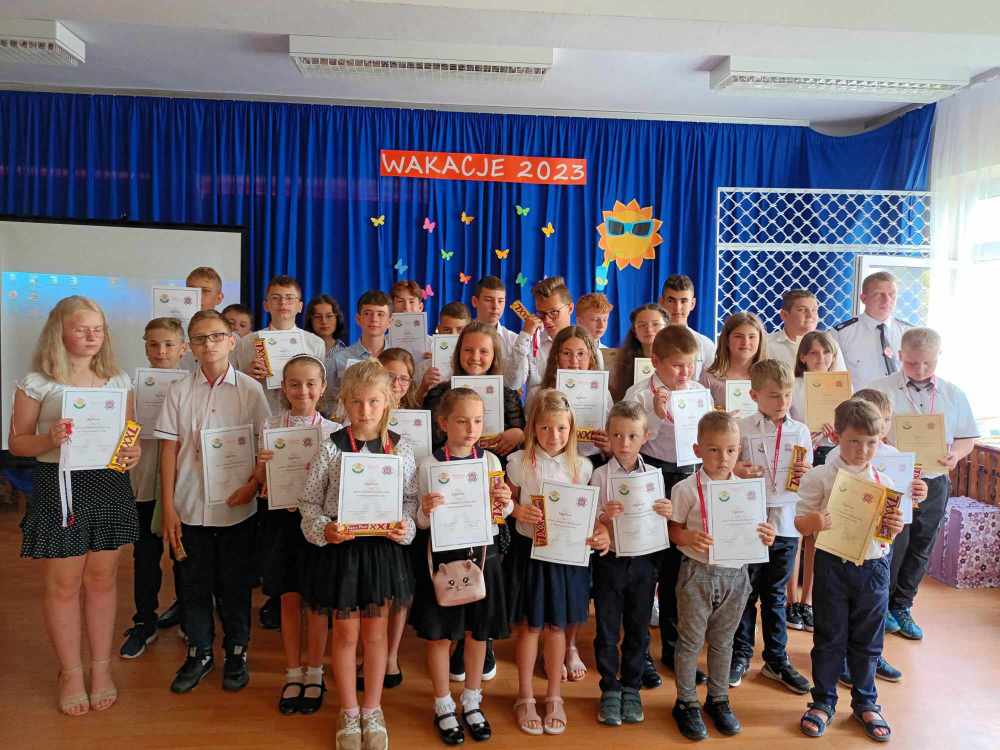 Uroczyste zakończenie roku w naszej szkole rozpoczęło się Mszą Świętą w kościele parafialnym. Po mszy uczniowie, nauczyciele oraz rodzice udali się do szkoły. Na początku Pani Dyrektor wręczyła uczniom świadectwa z wyróżnieniem oraz świadectwa ukończenia szkoły podstawowej uczniom klasy VIII. Następnie medale otrzymali uczniowie klasy III, który ukończyli pierwszy etap edukacji. Nagrodzono również tych uczniów, którzy brali udział w licznych konkursach i zajęciach SKS-u. Specjalną nagrodę otrzymała również Wiktoria Przepióra, która uzyskała najwyższą średnią w szkole. Dyplomy za aktywny udział w życiu szkoły, odebrali również rodzice.