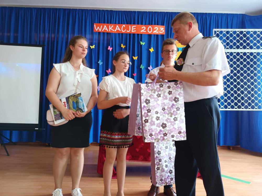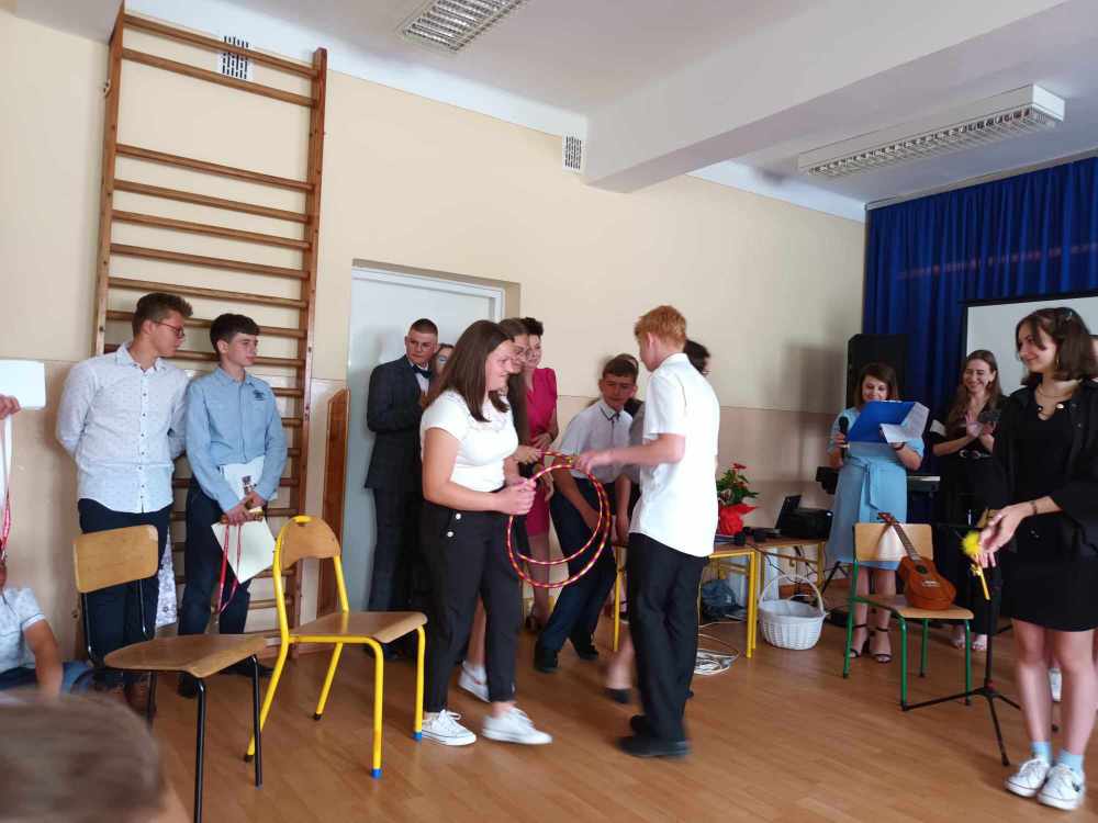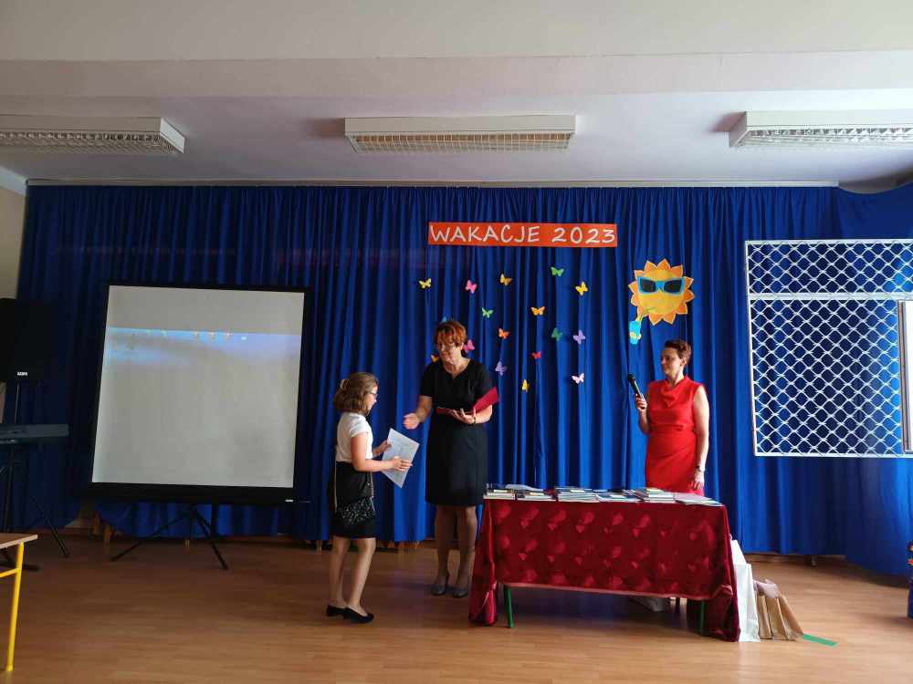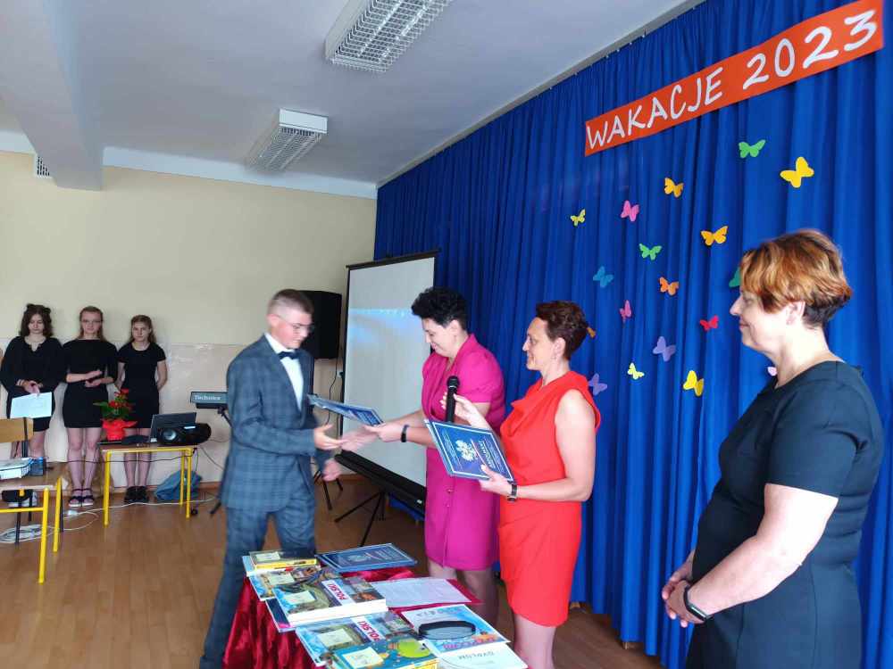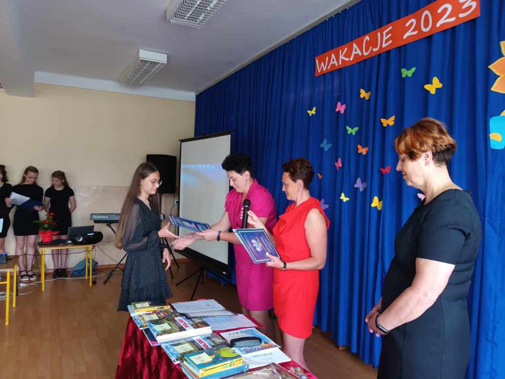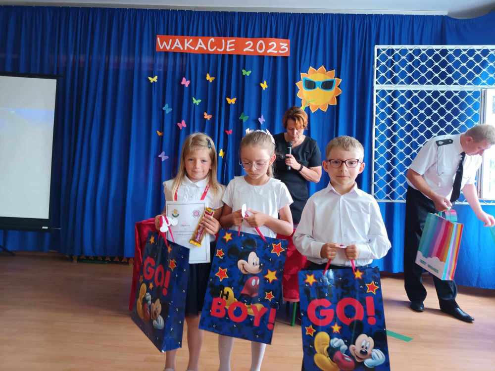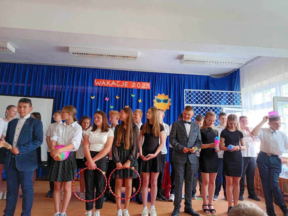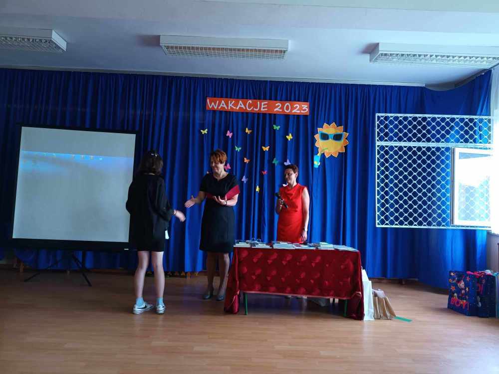 Uroczyste zakończenie roku w naszej szkole rozpoczęło się Mszą Świętą w kościele parafialnym. Po mszy uczniowie, nauczyciele oraz rodzice udali się do szkoły. Na początku Pani Dyrektor wręczyła uczniom świadectwa z wyróżnieniem oraz świadectwa ukończenia szkoły podstawowej uczniom klasy VIII. Następnie medale otrzymali uczniowie klasy III, który ukończyli pierwszy etap edukacji. Nagrodzono również tych uczniów, którzy brali udział w licznych konkursach i zajęciach SKS-u. Specjalną nagrodę otrzymała również Wiktoria Przepióra, która uzyskała najwyższą średnią w szkole. Dyplomy za aktywny udział w życiu szkoły, odebrali również rodzice.