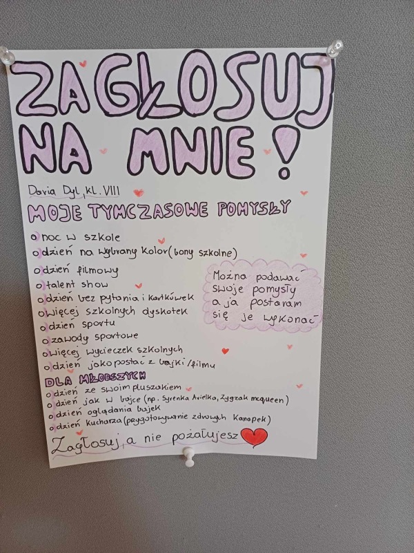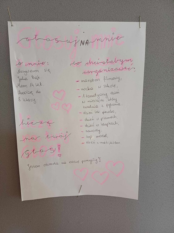 Wybory poprzedzone zostały kampanią przedwyborczą w czasie której poznaliśmy kandydatów – odważnych i przebojowych osób z pasją, pomysłami i twórczym podejściem do szkolnej codzienności.