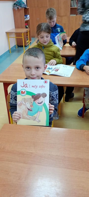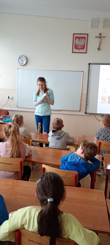 15 listopada najmłodsze dzieci z oddziału przedszkolnego oraz klas I-III wzięły udział w lekcji na temat prawidłowej higieny jamy ustnej, którą przeprowadził specjalny gość - pielęgniarka szkolna. Podczas zajęć pani pielęgniarka zapoznała dzieci z podstawową wiedzą na temat zębów, omówiła rolę, funkcje i budowę zęba. Zapoznała uczniów z zasadami mycia zębów oraz zaprezentowała akcesoria, które są niezbędne do dbania o higienę jamy ustnej. Ważnym akcentem lekcji, na który zwróciła uwagę było przedstawienie związku między odżywianiem, a zdrowiem zębów.